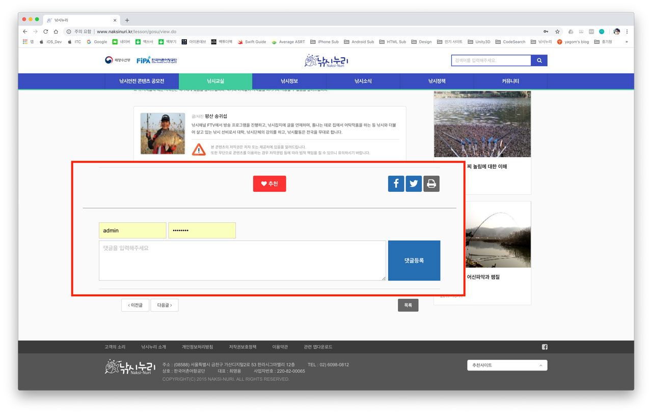 - 낚시누리 메인화면에서 낚시교실 > 낚시고수되기 메뉴를 클릭합니다.