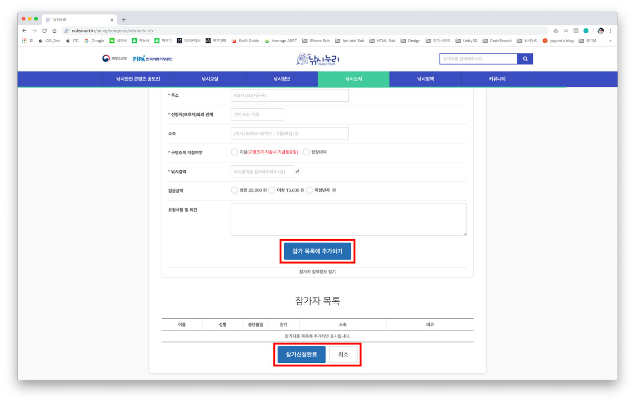 [매뉴얼 초기화면으로 이동] 낚시소식 > 낚시대회 > 참가신청서 작성하기 참가신청서 작성하기 낚시대회 상세화면에서 참가신청 버튼을 클릭하면 참가신청서 작성하기 입력폼 화면으로 이동합니다. 낚시대회 신청자 정보 입력 부분과 참가자 정보 입력 부분을 입력 후 참가자 목록에 추가하기 버튼을 클릭, 참가자 목록에 추가된 인원을 최종 확인 후 참가신청완료 버튼을 클릭하여 신청 접수를 완료 합니다. [매뉴얼 초기화면으로 이동]